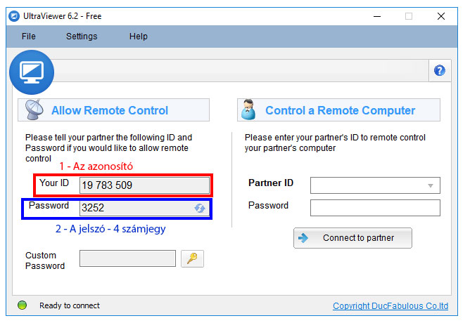 Mit kell lediktálni. Elsőnek a Yout ID melletti számsort majd a Password melletti négy számjegyet szükséges lediktálni.